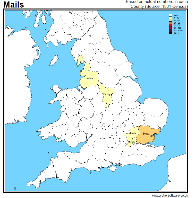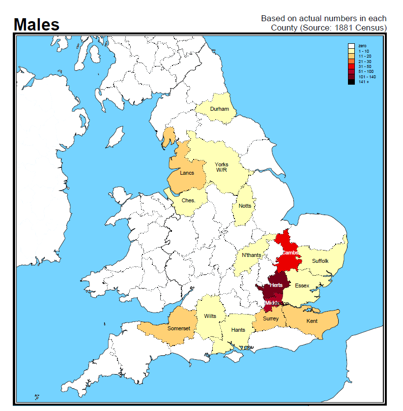 The maps below show the distributions of the MALES surname and its variants across England using data extracted from the 1881 Census of England and Wales. The actual number of occurrences of the name in the census is shown.