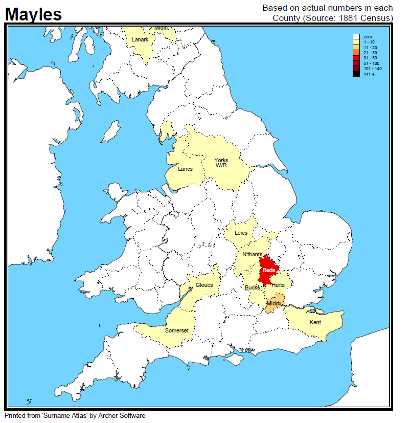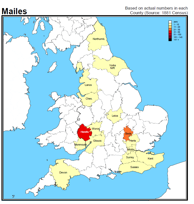 The MAYLES and MAILES variants have similar levels of recording with MAYLES most abundant in Bedfordshire and MAILES most abundant in Herefordshire and to a lesser extent in Bedfordshire.