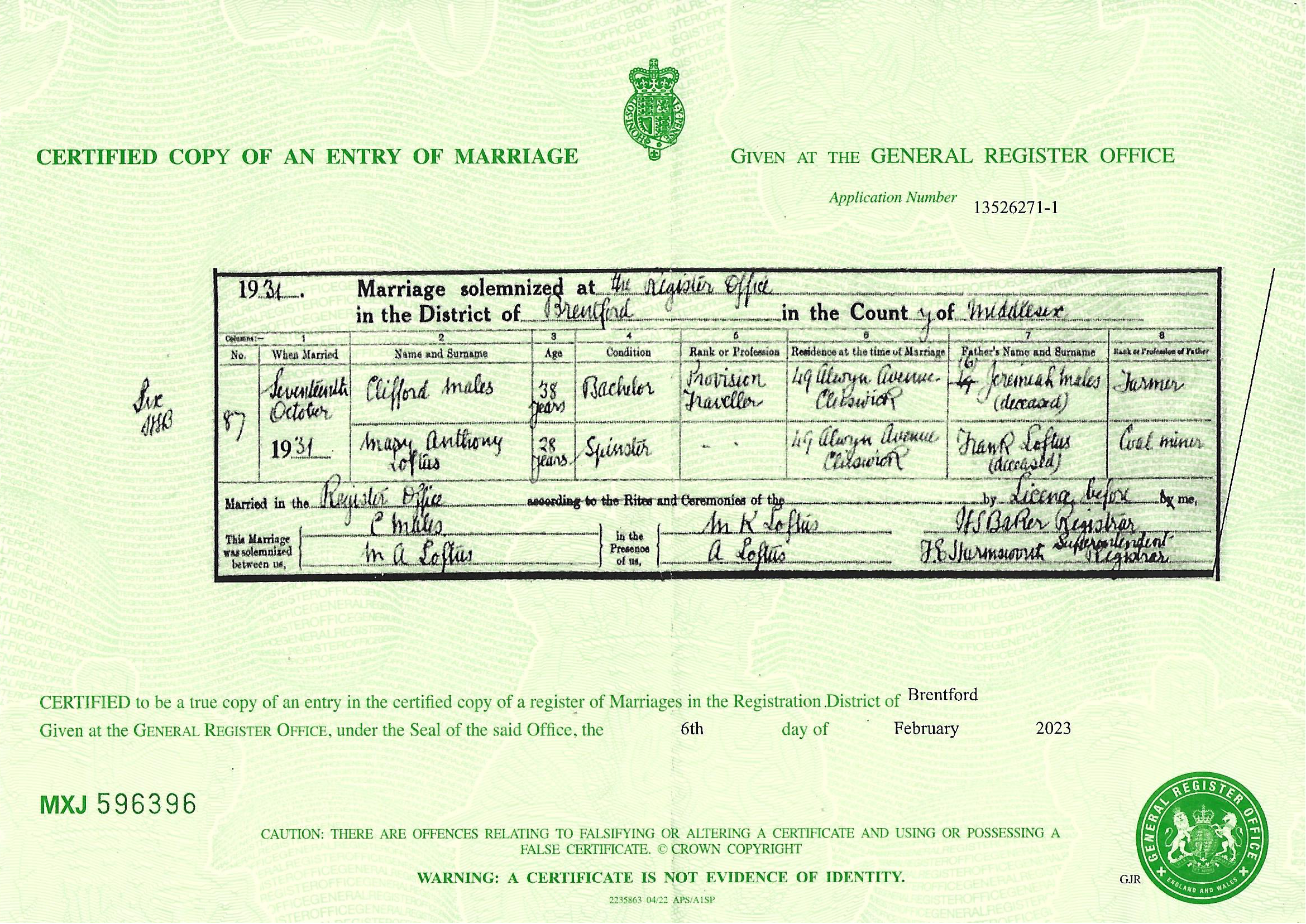 However, I did by search find a Clifford MALES marrying Mary Anthony LOFTUS in Brentford in 1931. This fitted with the Sussex electoral roll records. I decided to send for the certificate of his marriage to Mary A LOFTUS.